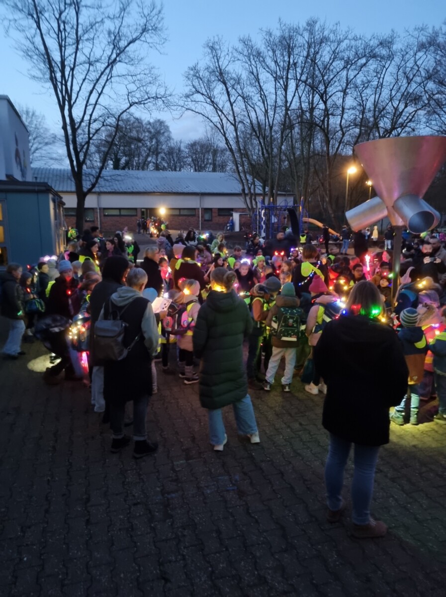 Zum Abschluss versammelten sich alle Kinder und Lehrkräfte auf dem Schulhof. Das gemeinsame Leuchten war ein wirklich beeindruckender Anblick! Zusammen wurden Lieder gesungen, bevor alle in ihre Klassenräume gingen.